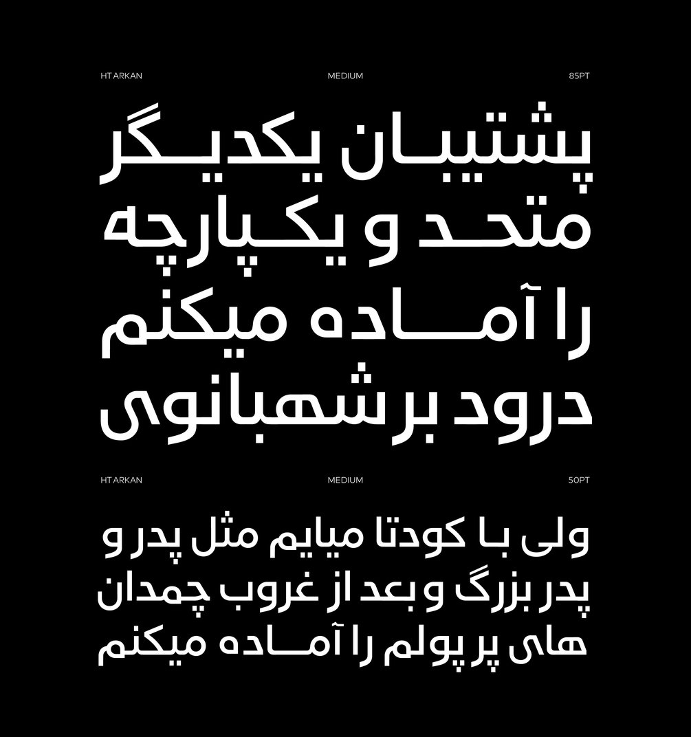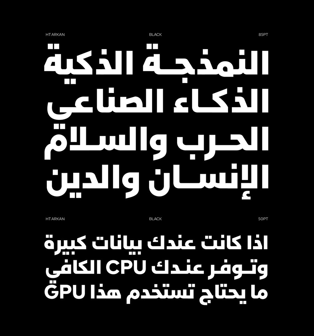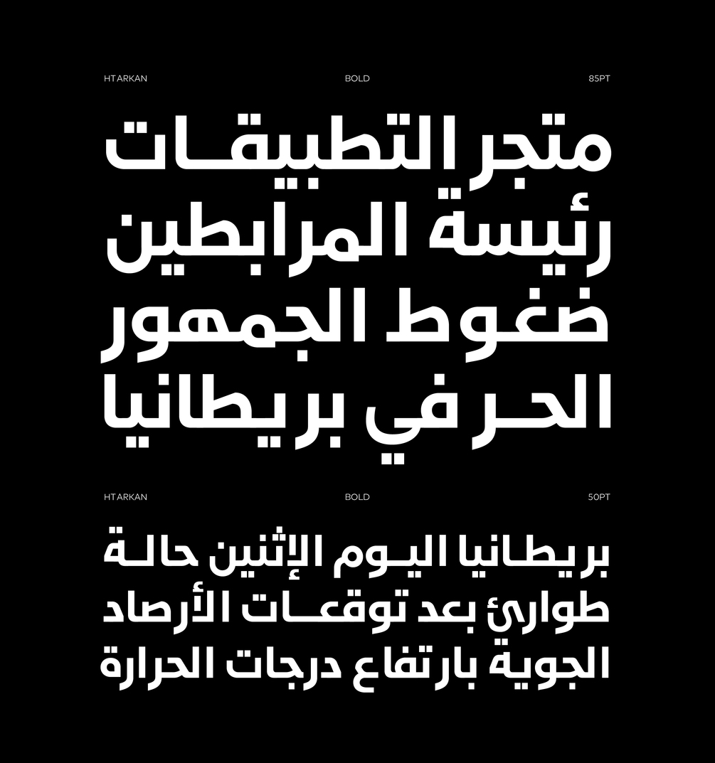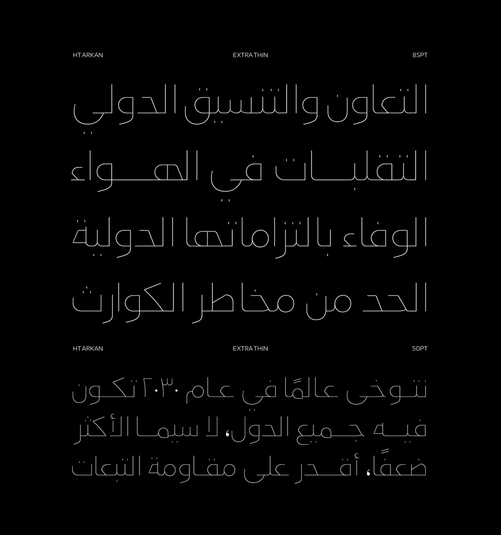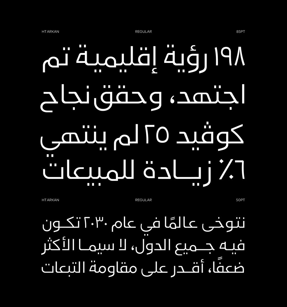 "HT Arkan" is an Arabic branding typeface created by Muhammed Hadi. The font family includes nine weights from Hairline to Ultra Black, providing versatility for design projects across various applications. Combining Naskh and Kufi styles, it is ideal for headlines, UI, advertising, and branding, exuding a friendly and modern aesthetic.