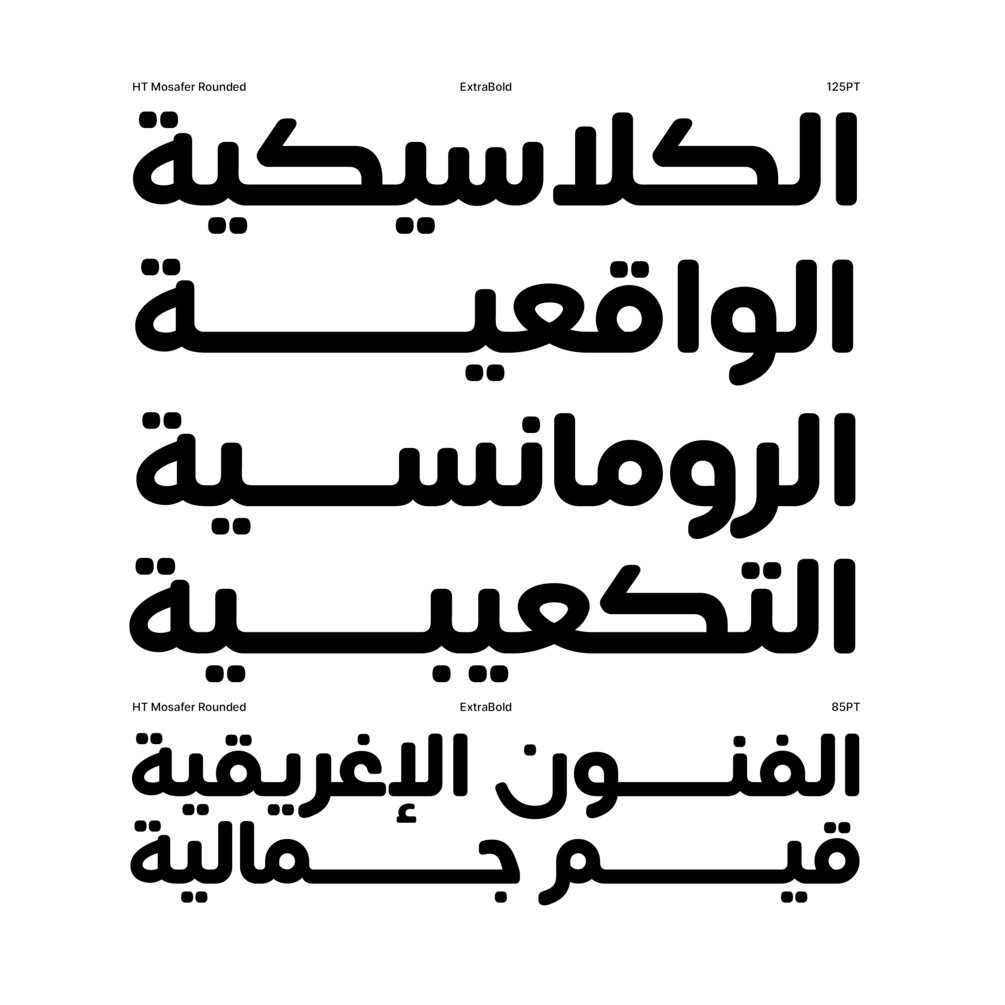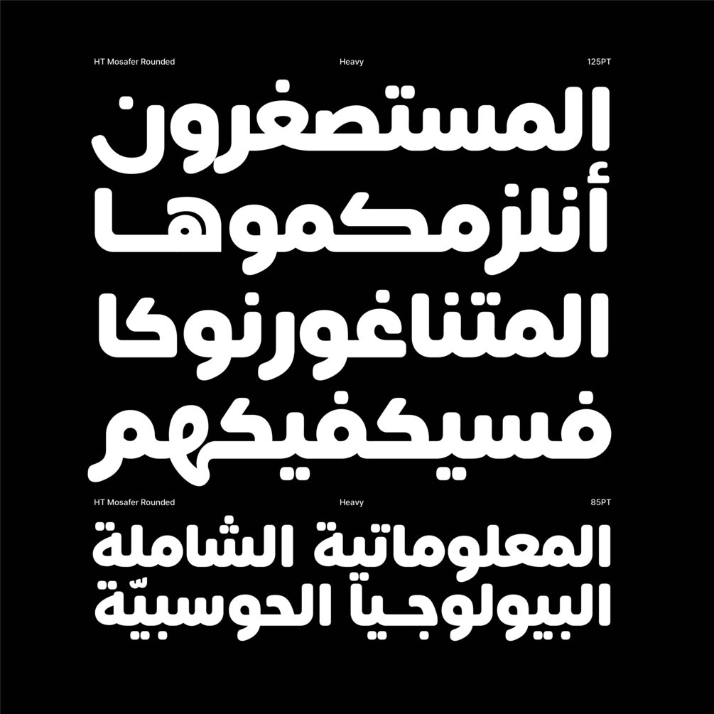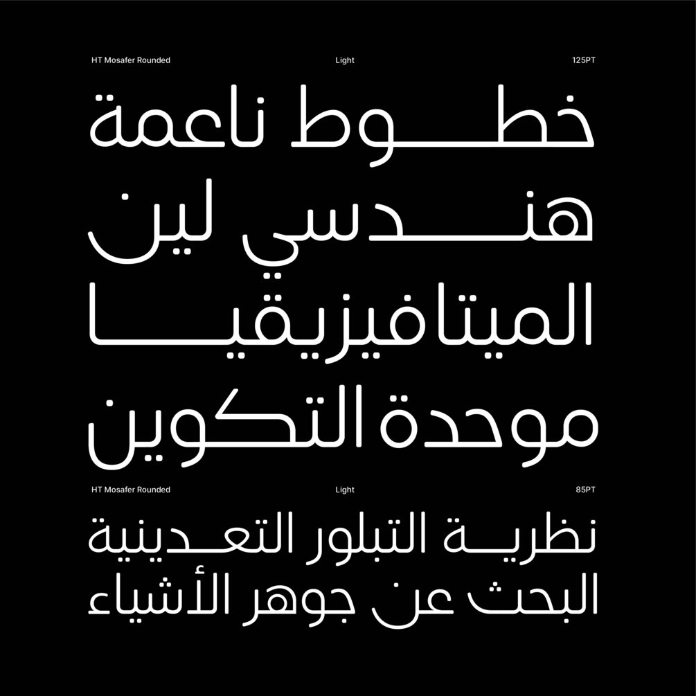 HT Mosafer Rounded is a soft contemporary geometric typeface that blends distinct minimalist characteristics with mainstream details. It originates from Mosafer, a superfamily with a warm well-balanced texture and a distinct personality.